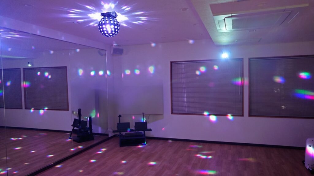 最新のリハビリ用自転車やミラーボール・音響を備えた、明るく開放的な空間です。